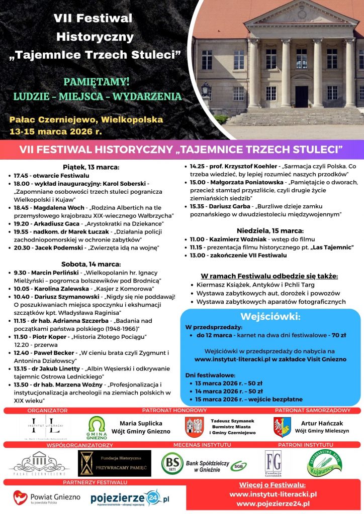 Jak już informowaliśmy, od 13 do 15 marca 2026 roku w Pałacu w Czerniejewie odbędzie się VII Festiwal Historyczny „Tajemnice Trzech Stuleci”. Punkty Festiwalu, które odbędą się 13 i 14 marca już przedstawiamy na poniższym plakacie. Dzisiaj czas na zaprezentowanie szczegółów tego, co odbędzie się w niedzielę, 15 marca! A będzie to wyjątkowe wydarzenie!